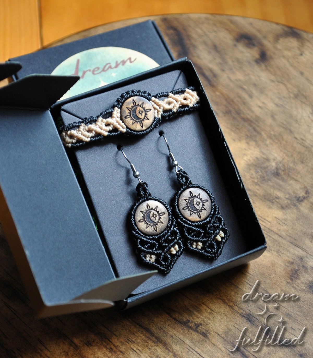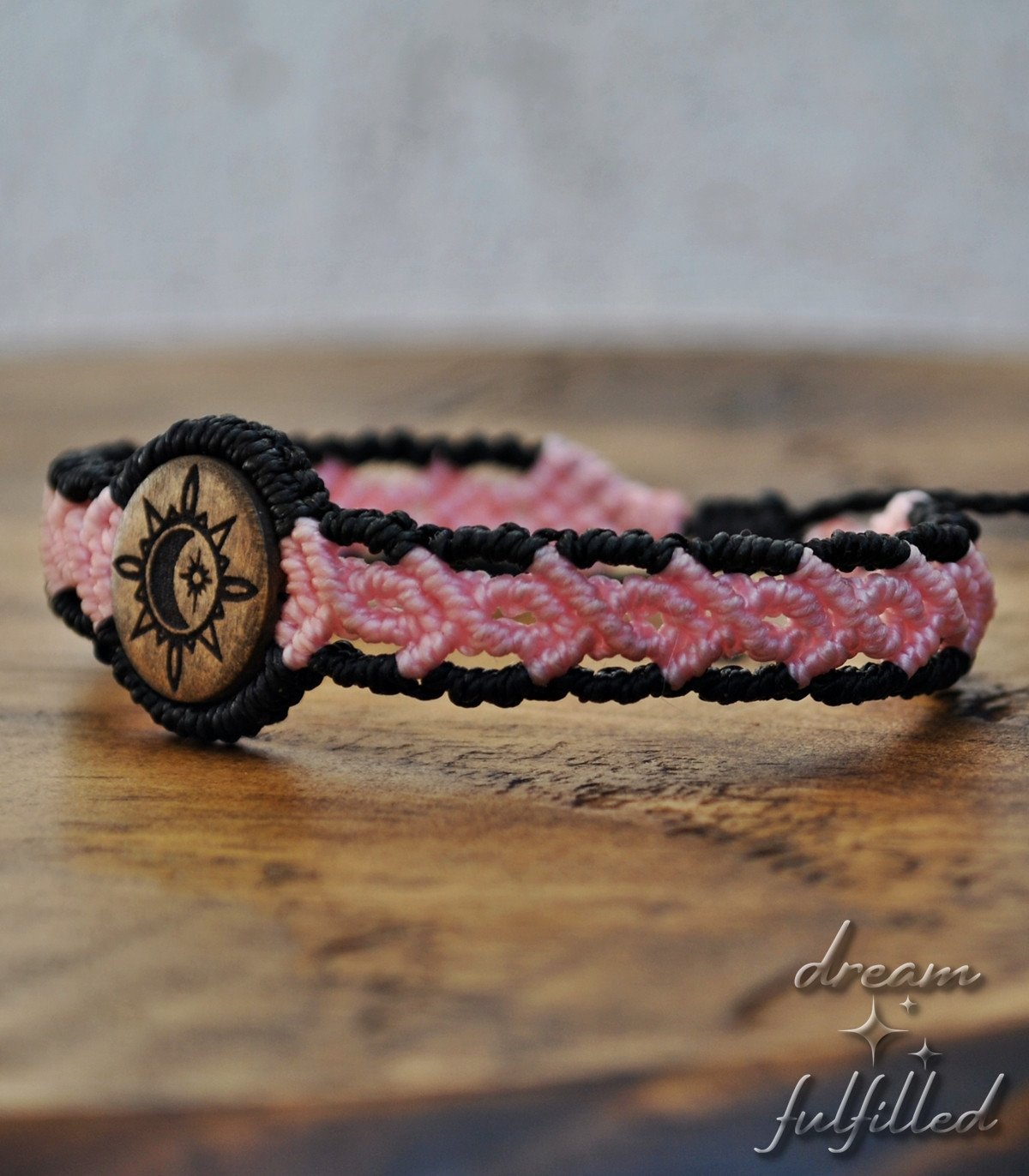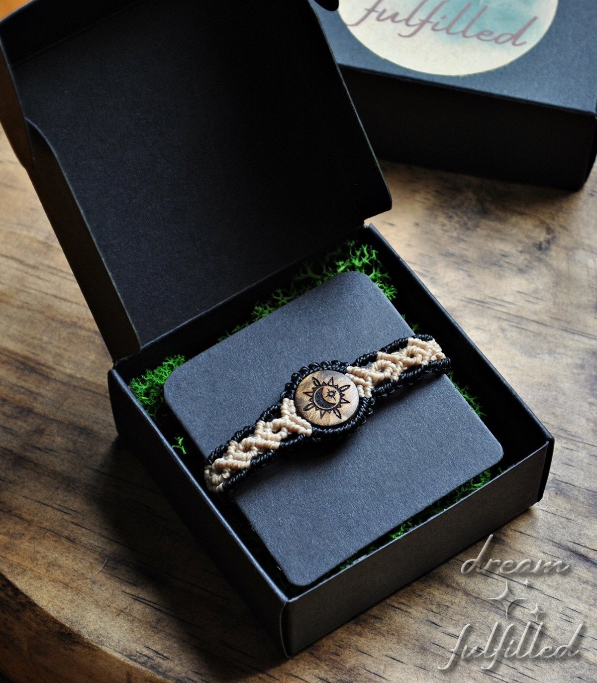 Name: Wooden and macramé bracelet engraved with Sun, Moon, and Star