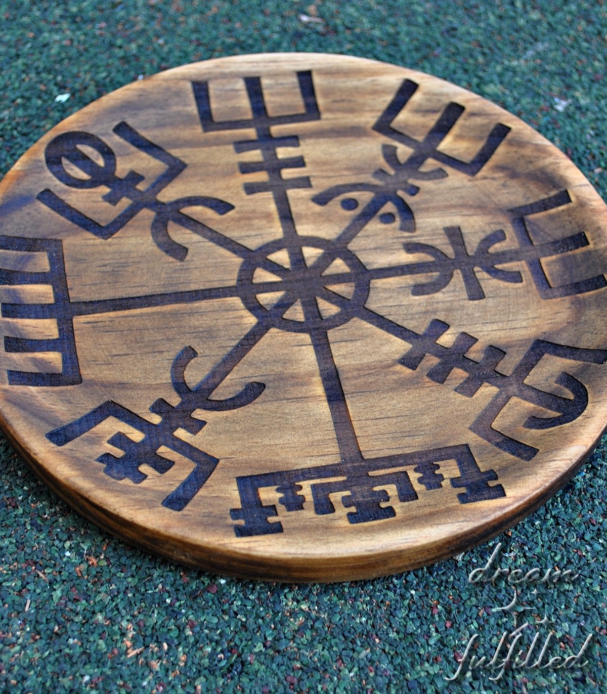 Decorative wooden plate with the Viking symbol Vegvísir laser engraved. Dark stained finish with the option of adding a hook on the back for hanging.