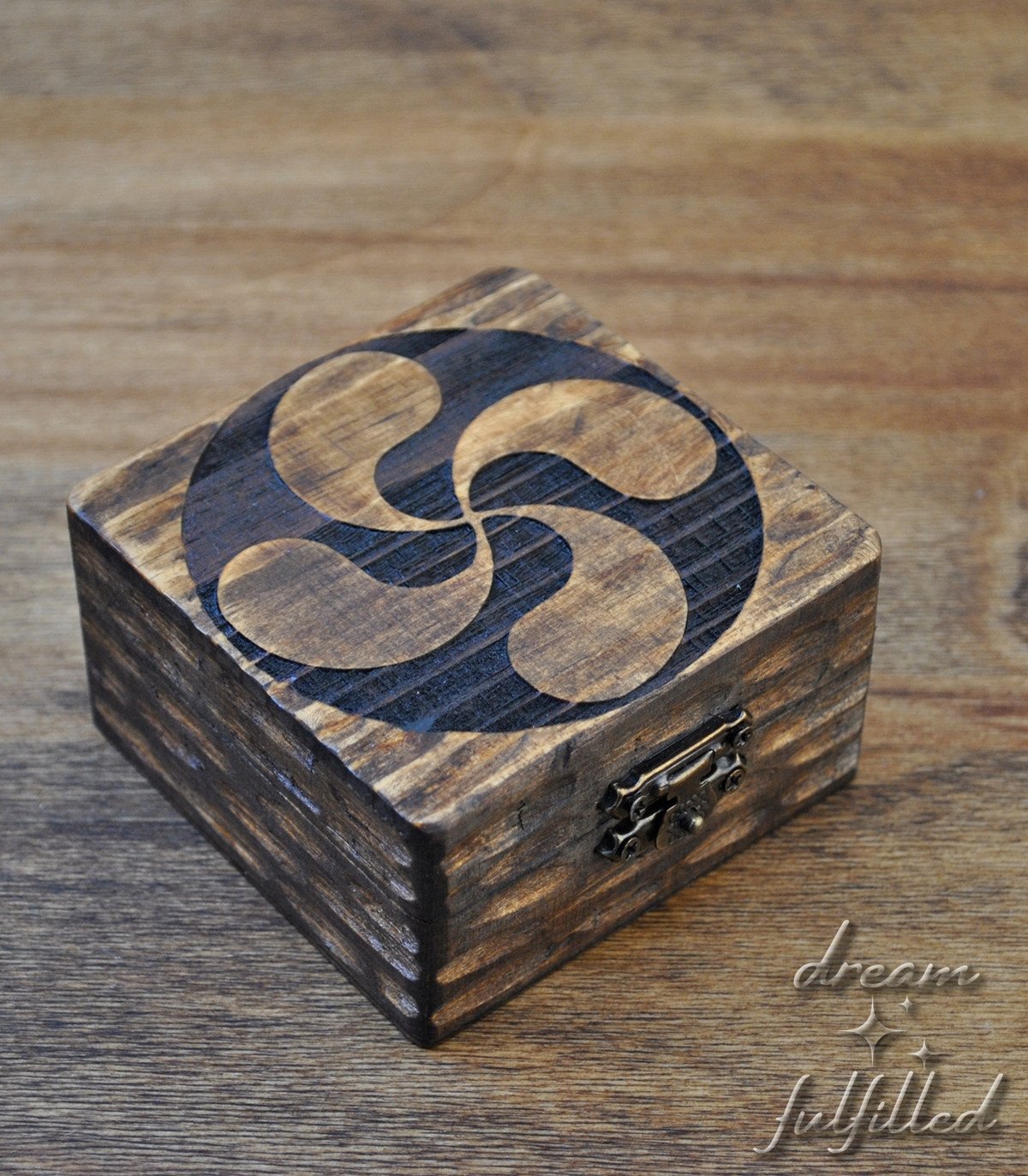Caja artesanal de madera grabada con el símbolo del Lauburu, este símbolo a lo largo de los siglos ha tenido muchas interpretaciones: la representación del sol y su energía vital, el ciclo de la vida, la unión de los cuatro elementos, e incluso la protección frente a las fuerzas negativas.
