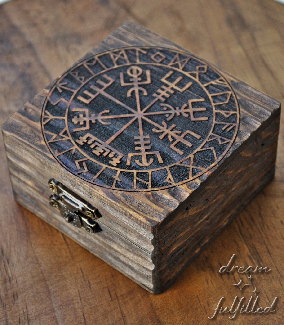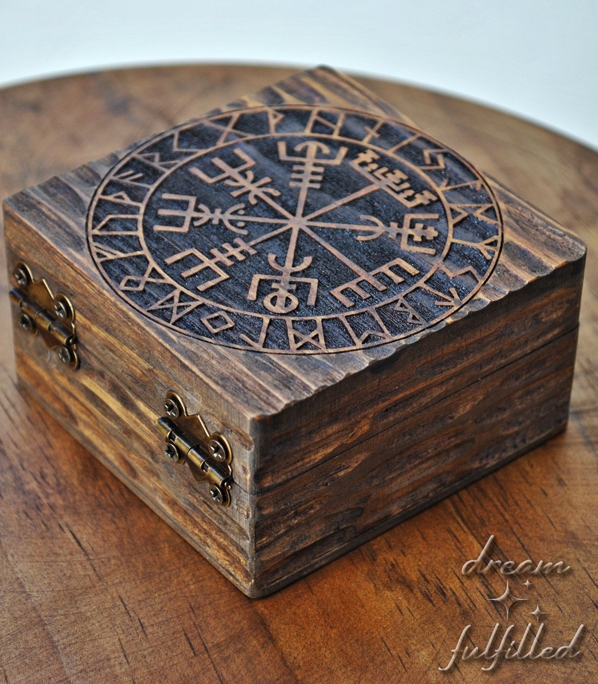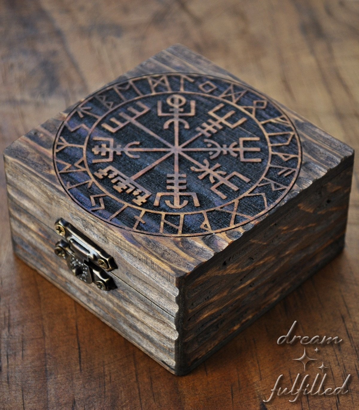 Caja artesanal de madera grabada con el símbolo vikingo del Vegvisir, realizada en madera, teñida y tallada aportándole un aspecto antiguo.